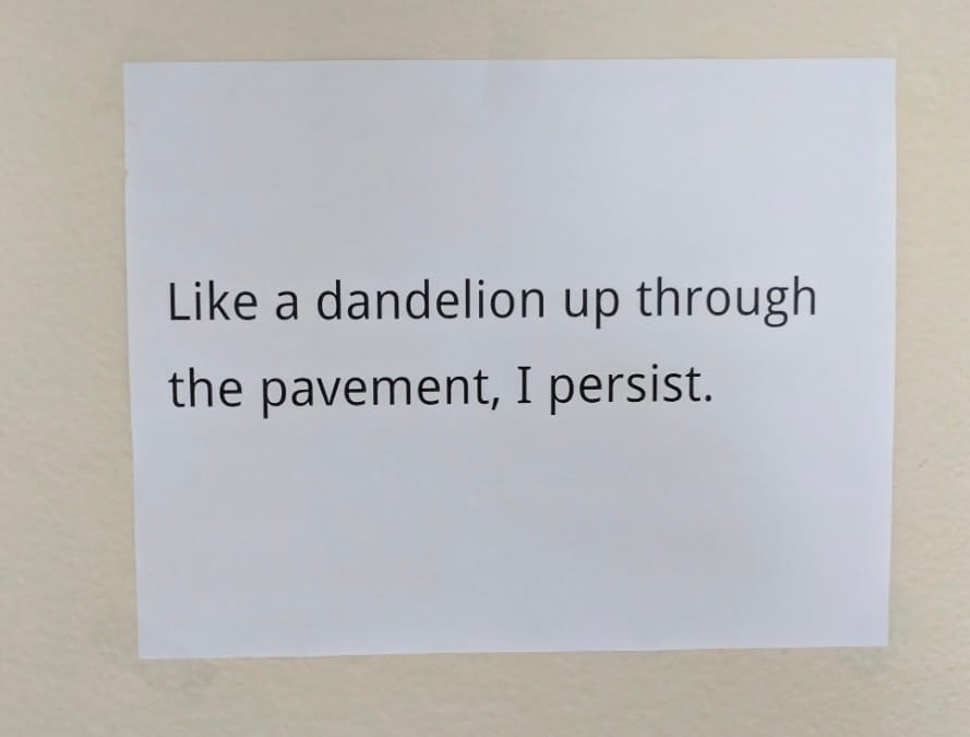 Every time I see that photo, or catch the first few chords of that song, I think about the person I was. Motionless, adrift, but still reaching for something, even if it was just a single line on a piece of paper. And I think about that quote: Like a dandelion up through the pavement, I persist.